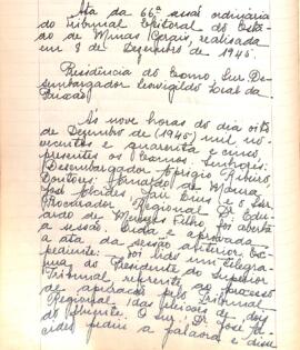 Ata da 66ª Sessão Ordinária do Tribunal Regional Eleitoral de Minas Gerais, realizada em 08/12/1945, às 09:00, na sala das sessões.